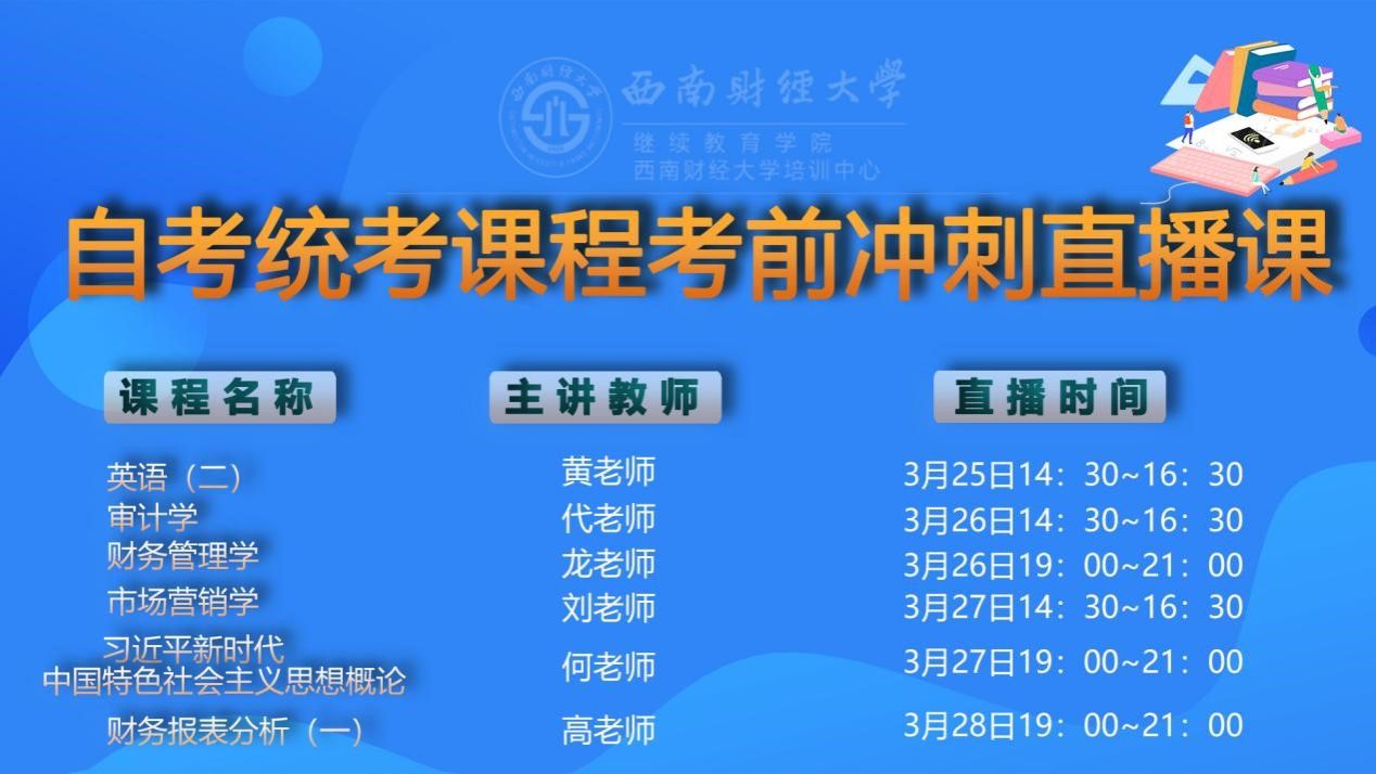 2025年4月的自考统考进入倒计时,为了帮助大家高效备考,公司将于2025年3月25日起开展本次统考课程考前冲刺直播课。课程及时间安排如下(线上直播地址另行通知)。