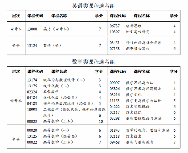 考生如不考“高等数学(一)”(课程代码00020)、“高等数学(工专)”(课程代码00022)、“高等数学(经管类)”(课程代码13125),可以选考“数学的观念、思想和方法”(课程代码01843)、“信息检索”(课程代码02118)、“创新与创新教育”(课程代码09468);考生如不考“高等数学(工本)(课程代码00023)”、“离散数学”(课程代码02324)、“概率论与数理统计(经管类)”(课程代码04183)、“线性代数(经管类)”(课程代码04184)、“工程数学(线性代数、概率论与数理统计)”(课程代码10993)、“概率论与数理统计(工)”(课程代码13174)、“线性代数(工)”(课程代码13175),可以选考“信息组织”(课程代码02117)、“数学文化”(课程代码03216)、“创新思维理论与方法”(课程代码03298)、“信息管理概论”(课程代码04222)、“数学思考与问题解决”(课程代码05826)、“数学思想与方法”(课程代码09097)、“数学史与数学方法论”(课程代码11153),选考课程学分不低于原课程学分。