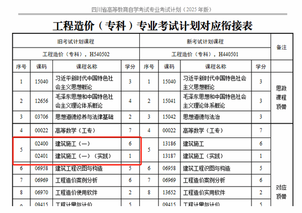 比如,工程造价(专科)专业考试计划中的“建筑施工(一)”(课程代码02400)课程,考生如果只取得了原计划中“建筑施工(一)”(课程代码02400)合格成绩,那么需要继续参加“建筑施工(一)(实践)”(课程代码02401)考核并取得合格成绩,方可按照《四川省高等教育自学考试专业考试计划对应衔接表》进行对应顶替。考生也可以直接参加新考试计划课程的考试。