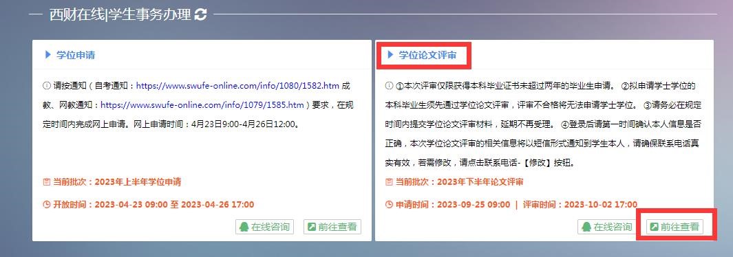 1.登录学位论文评审平台:西财在线—西财在线入口—员工事务办理—学位论文评审,点击“前往查看”—学位论文评审登录。(见下图)