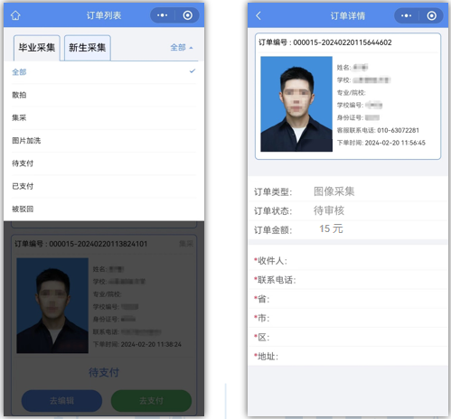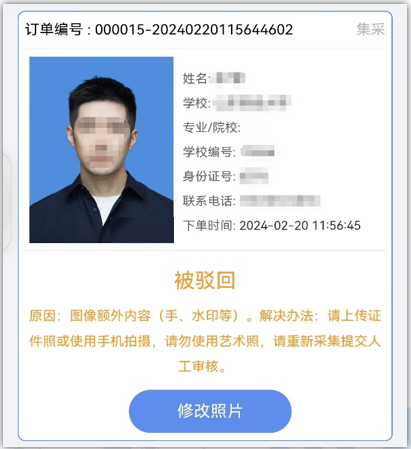 7.关于人工审核。支付完成后请同学关注个人订单页面,后台将在7个工作日内对采集的图像进行人工审核,如图像不符合采集标准,后台会驳回并给出重拍意见,同学可点击修改照片重新上传。
