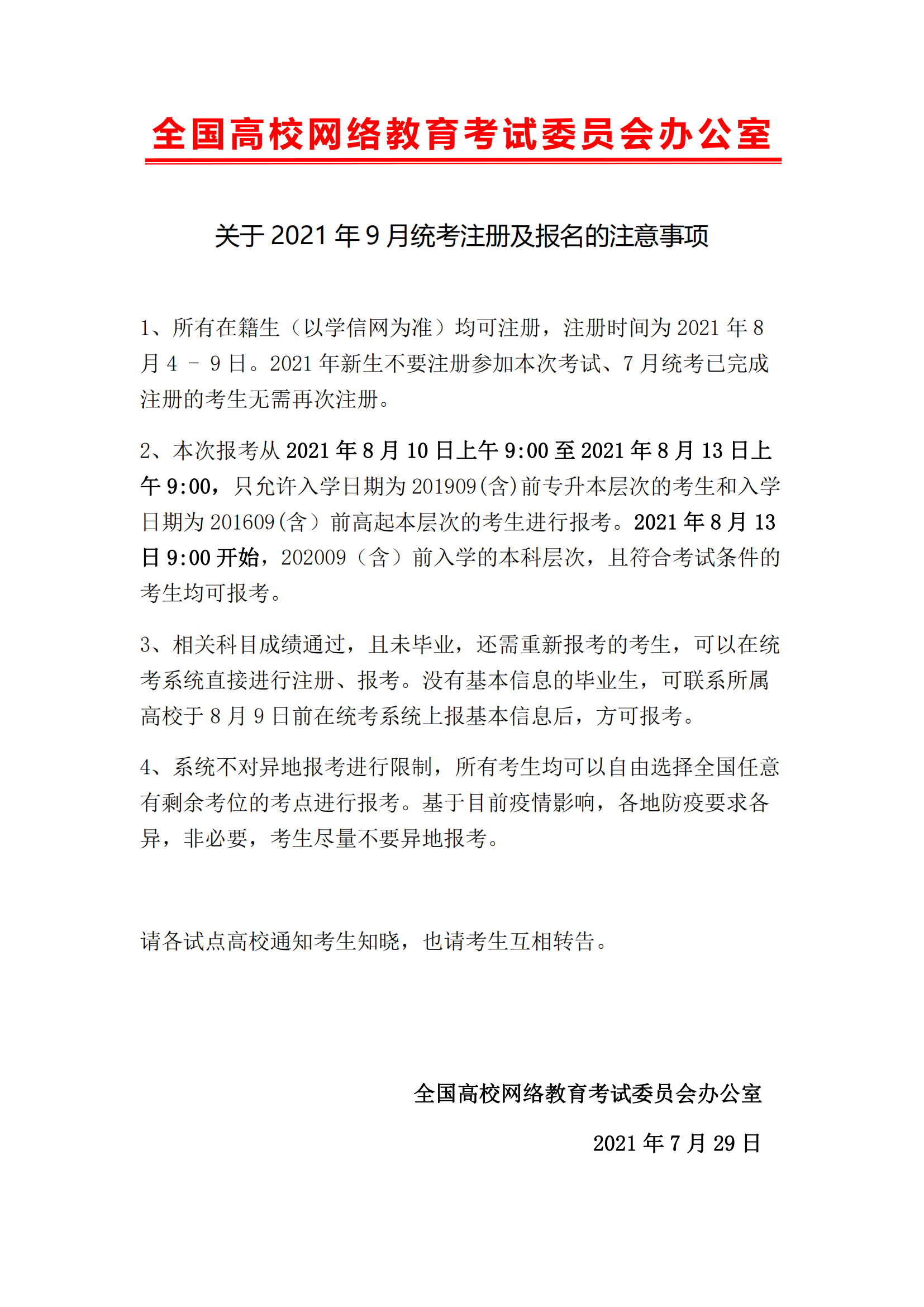 根据教育部的要求和全国高校网络教育考试委员会办公室《全国高校网络教育部分公共基础课统一考试2021年9月考试工作安排》(网考电函[2021]33)和《2021年9月考试工作整体流程》(网考电函[2021]34),现将2021年9月统考考试相关工作通知如下: