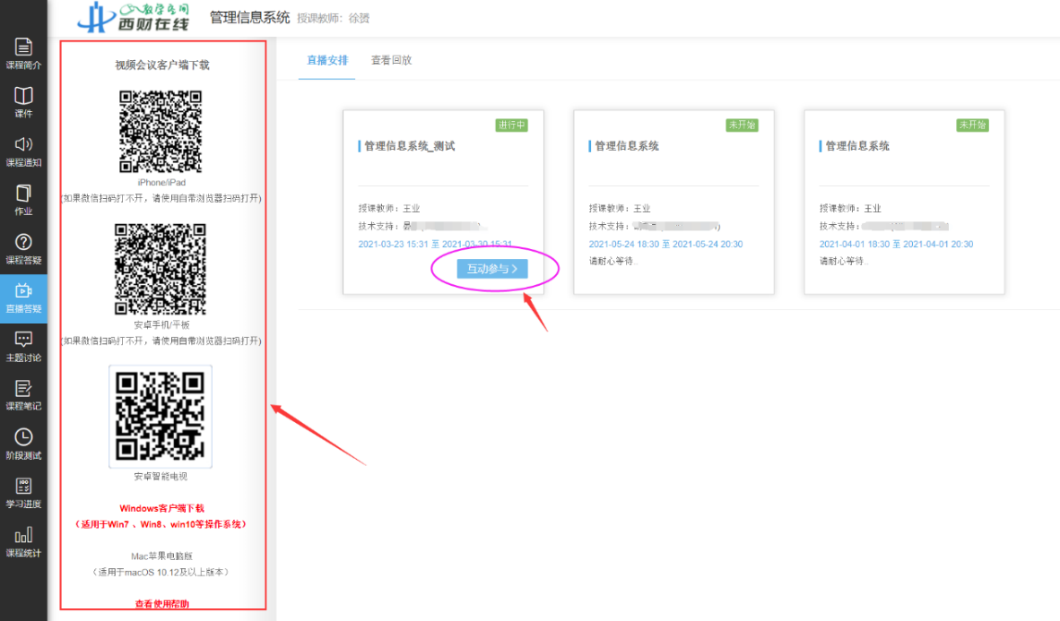 参与方式:在学习平台“直播答疑”专栏中根据左侧提示下载安装视频会议客户端,待直播答疑权限开放后点击“互动参与”按钮进入参与即可。同学们可提前准备好课程学习过程中遇到的相关问题,在答疑时间内进入平台客户端参加互动。