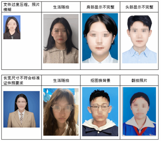 考生需自行登录预报名系统(https://xczx7.swufe.edu.cn/svue/cet/cetapply),按提示完成预报名流程,预报名时须检查照片,照片高宽比例为4:3,不符合标准的照片需重新上传近期蓝底彩色照片。照片要求清晰正式,禁止使用美图类软件处理,单张照片大小不超过200KB。常见不符合报名要求的照片示例如下: