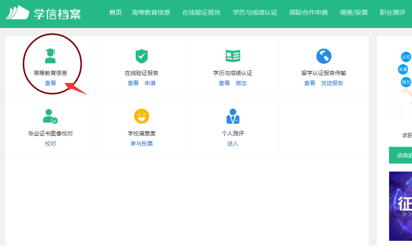 2.进入“学信档案”选择“高等教育信息”,根据显示的个人学籍注册信息逐一认真核对,包括姓名、身份证号码、就读院校名称、专业名称、层次、录取照片、学籍状态:“在籍(注册学籍)等”,确认注册信息无误后退出该系统即可。如发现注册信息有误或存在疑问,须及时向所在站点老师反映。员工本人可通过学信网平台申请“学籍在线验证报告”。