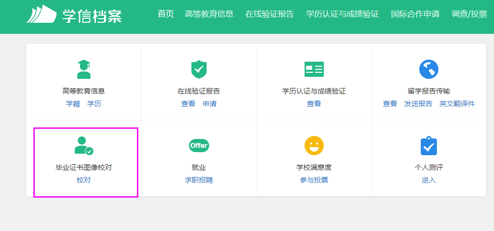 第二步 登录“学信档案”,点击“毕业证书图像校对”;