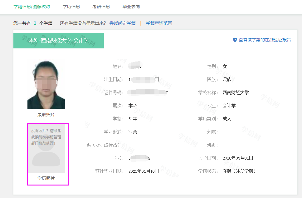 第三步;确认本人在读学籍的“学历照片”是否正确,如发现学籍信息或者照片有误,及时与所在学习中心、站点老师联系修改。