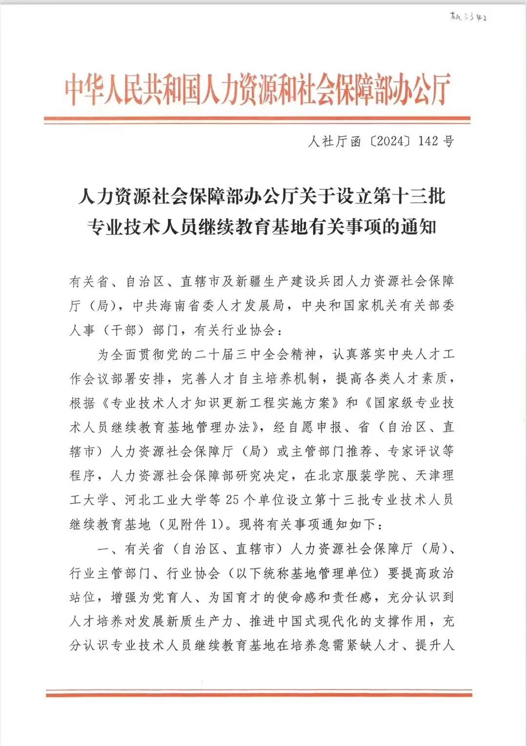 近日,人力资源和社会保障部办公厅印发《关于设立第十三批专业技术人员继续教育基地有关事项的通知》(人社厅函〔2024〕142号),由继续(网络)教育公司组织申报的 “国家级专业技术人员继续教育基地”成功获批!