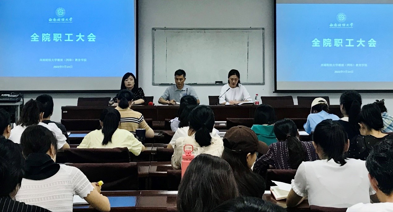 7月14日上午,继续(网络)教育公司在计算机楼106视频会议室召开全院职工大会,总结回顾春季学期各项工作,安排部署近期及下学期工作重点。经理曾朝夕主持会议。