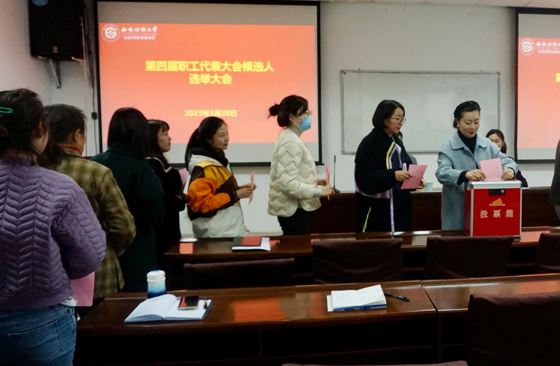 会议进行了公司第四届职代会正式代表选举工作。顾书记就公司第四届职代会正式代表选举工作程序做了说明,并宣读了代表候选人名单。与会职工按照选举工作要求郑重地投下了自己神圣的一票。经过投票选举产生了23名公司第四届职代会正式代表,他们将切实承担起团结职工、服务大局、促进发展的责任,为院校治理结构的不断完善献言献策。