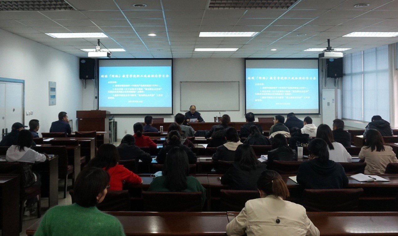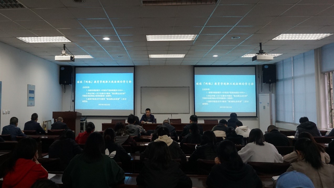 10月12日下午,继续(网络)教育公司在计算机楼106视频会议室召开全院职工政治理论学习会。院领导带领全体职工集中学习《中国共产党组织建设100年》,并结合党史学习教育以来“我为群众办实事”活动传达公司通知,并通报公司相关工作开展情况。会议由党总支书记殷晓明主持。