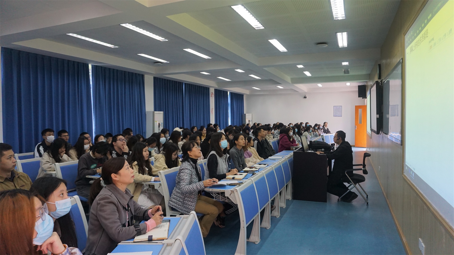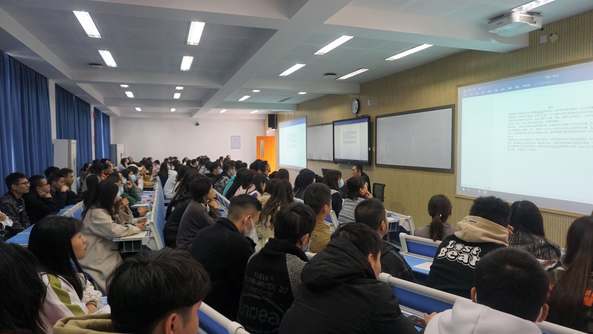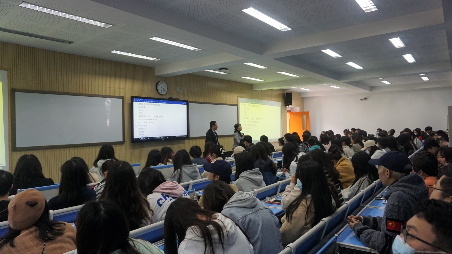 何老师结合自己的教学经验和体会,针对运用办公软件常见的问题,向大家详细讲解、演示了excel的操作方法和应用技巧,包含文档分页分节、域的使用技巧、办公软件协同中的邮件合并、表格数据处理技巧等方面的内容。讲座过程中,何老师还留了一些问题给大家思考,鼓励大家通过实际的操作去解决处理文档中遇见的一些难题。何老师灵活生动的教学方式给大家留下了极其深刻的印象。