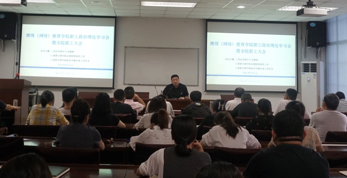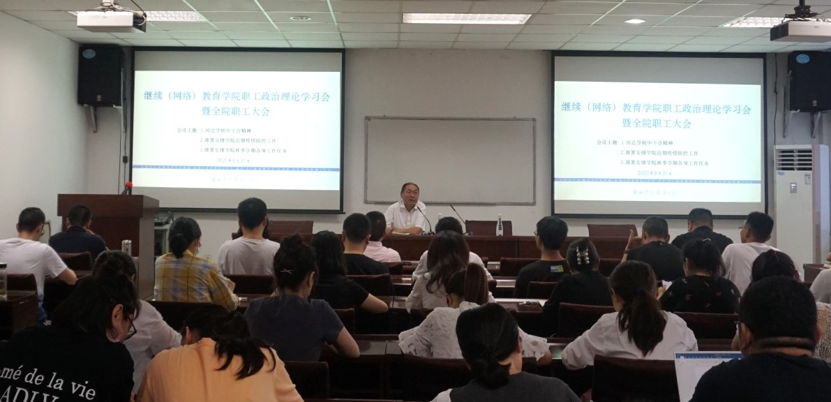 8月31日下午,继续(网络)教育公司在计算机楼106视频会议室召开全院职工政治理论学习会暨全院职工大会,传达公司中干会精神、部署安排公司近期疫情防控工作以及公司秋季学期各项工作任务。党总支书记殷晓明主持会议。
