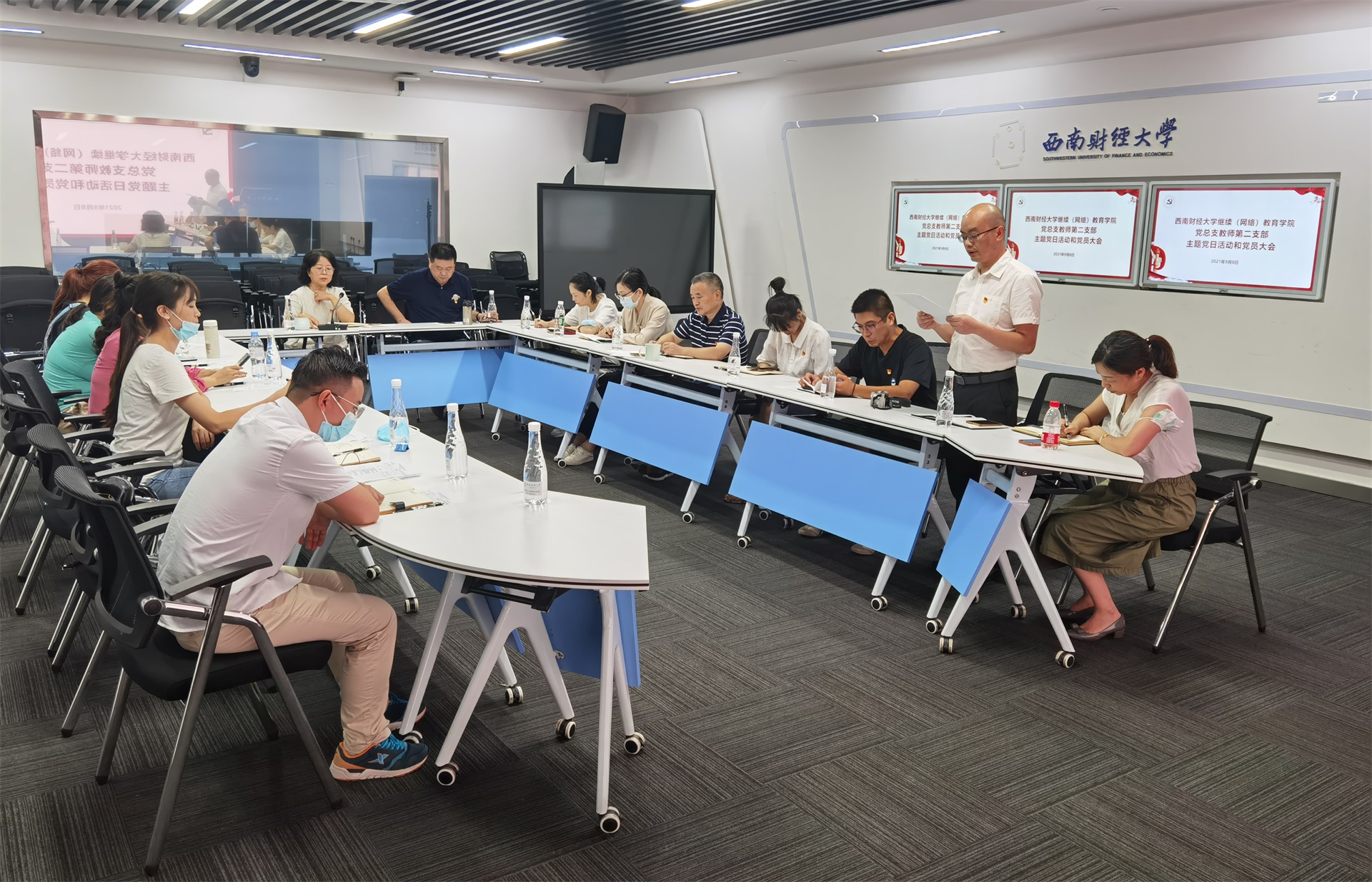 2021年9月8日下午,教师第二党支部在光华校区未来教室召开党员大会和主题党日活动,活动由支部书记郑斌同志主持。