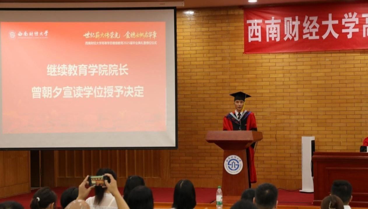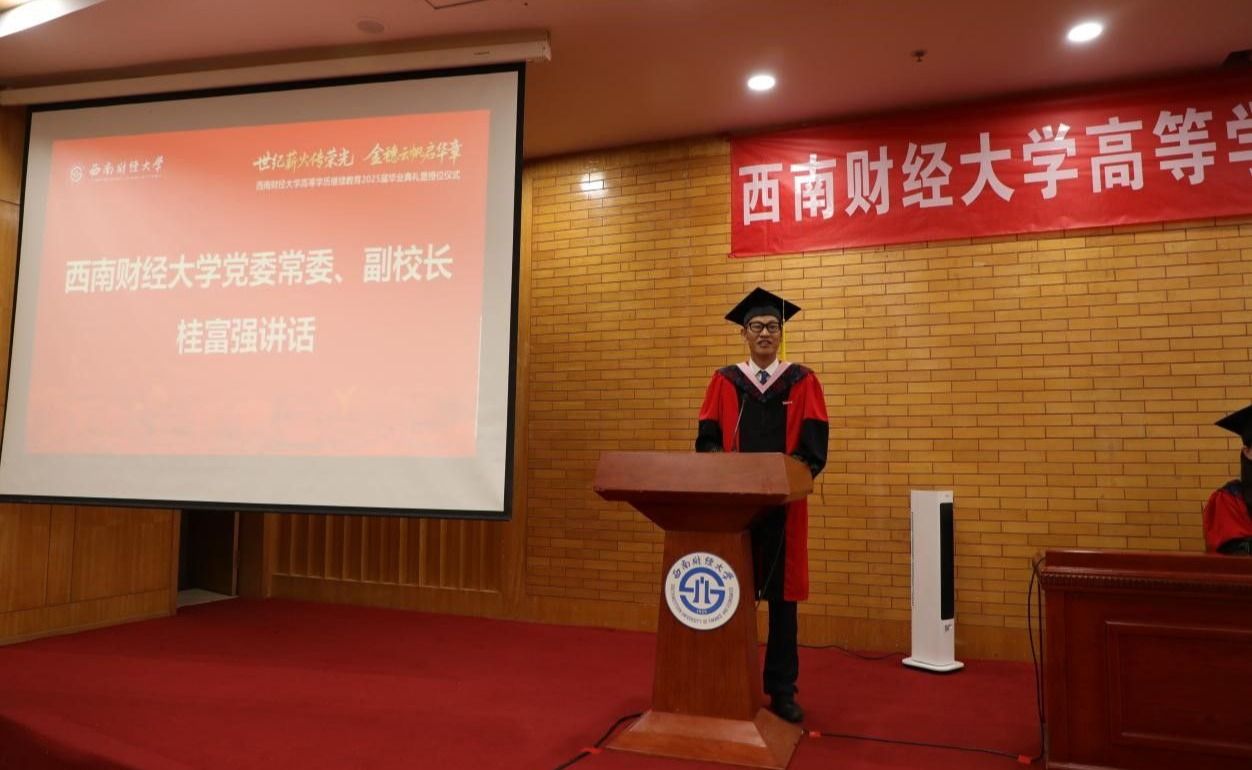 桂富强副董事长以《世纪薪火传荣光 金穗云帆启华章》为题,深情寄语2025届毕业生。他向顺利完成学业的同学们致以最热烈的祝贺,向关心支持同学成长的师长和家人致以最诚挚的感谢,希望同学们在平凡中创非凡,将个人的成长轨迹、家庭的幸福愿景,与国家繁荣昌盛的宏伟蓝图紧密交织,同频共振;重德行,善学习,主动拥抱变革,持续汲取新知,拓展认知边界,锤炼批判思维、创新能力和解决复杂问题的核心素养;做西财新百年征程的同路人,接过百年薪火,传承“大气为人、大智谋事、大爱行天下”的西财青年品格,以蓬勃的青春之力,为中华民族伟大复兴的中国梦添彩增色。他鼓励同学们在新征程中,初心如炬、风雨不惧,闪烁属于自己的星光,像骏马一样纵横驰骋。