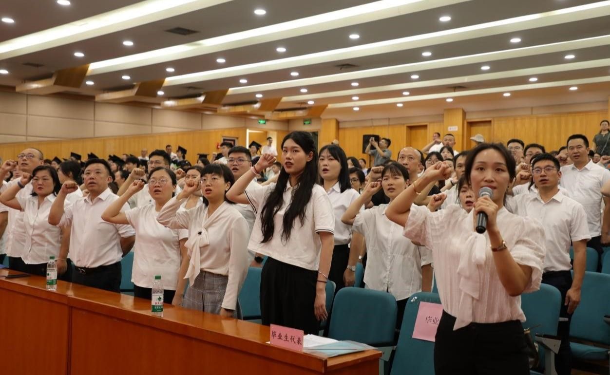 全场毕业生高举右拳齐声宣誓:将不忘初心、捍卫真理,不惧风雨、勇挑重担,以国家利益为重,让青春在祖国和人民最需要的地方绽放,为中华民族伟大复兴和人类文明共同进步贡献力量。
