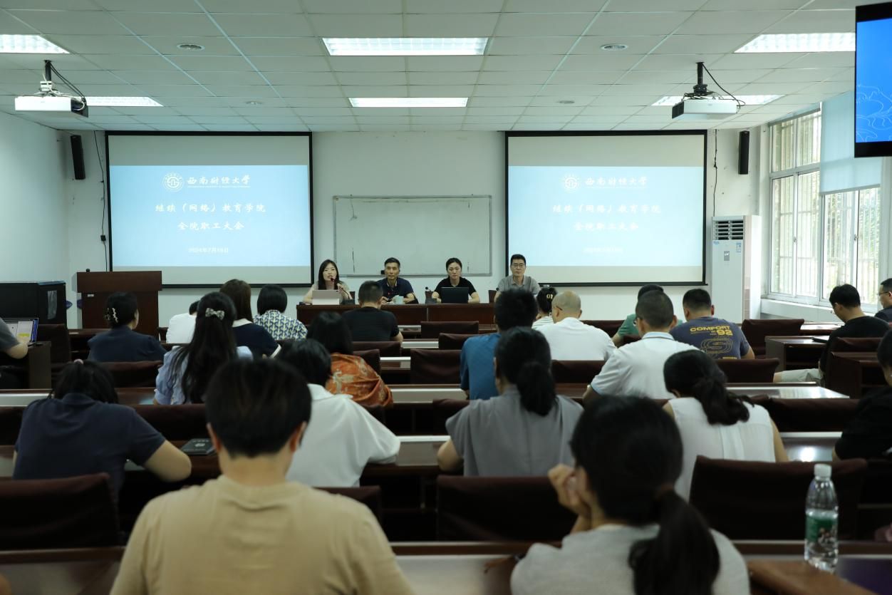 7月18日下午,继续(网络)教育公司在光华校区计算机楼106视频会议室召开全院职工大会,总结回顾本学期各项工作,安排部署暑期工作。经理曾朝夕主持会议。
