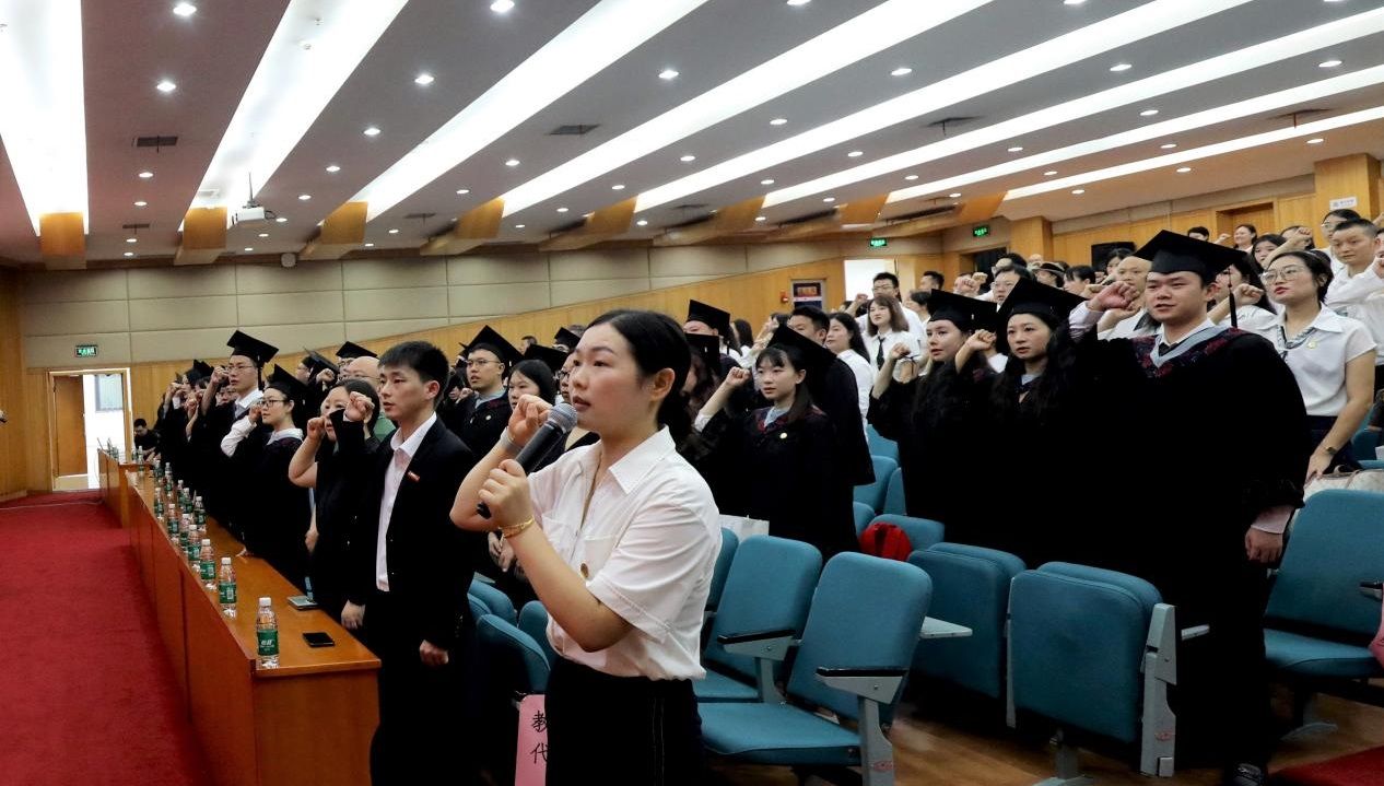 全场毕业生高举右拳齐声宣誓:将不忘初心、捍卫真理,不惧风雨、勇挑重担,以国家利益为重,让青春在祖国和人民最需要的地方绽放,为中华民族伟大复兴和人类文明共同进步贡献力量。